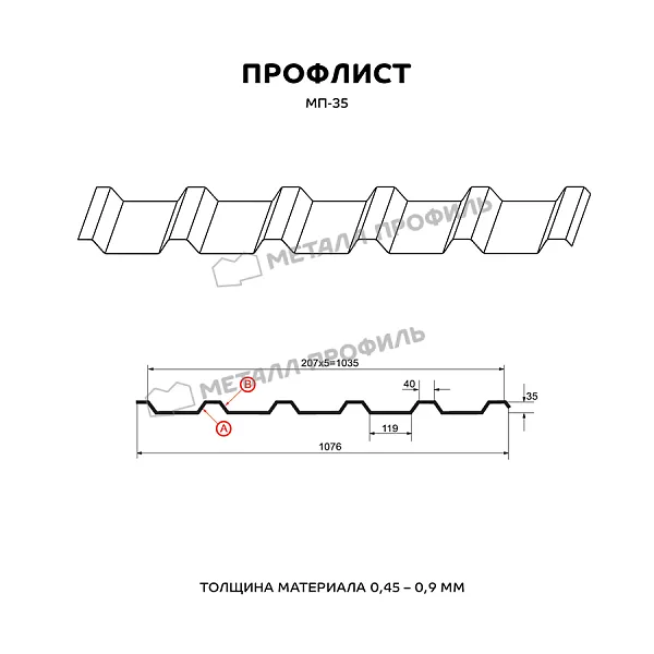Профлист МЕТАЛЛ ПРОФИЛЬ МП-35x1035-B (ПЭ-01-3009-0,7) широко применяется для обустройства профилированного листа. Представляет собой металлический оцинкованный лист с покрытием. Толщина металла с оцинковкой и декоративно-защитным покрытием — 0.7 мм. После проката на специальном оборудовании сталь принимает волнообразный вид. Жёсткость такого листа гораздо выше плоского.
