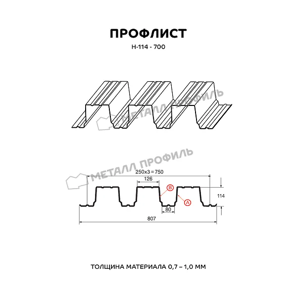 Профлист МЕТАЛЛ ПРОФИЛЬ Н-114x750-B (ПЭ-01-9003-0,9) — популярный материал для обустройства профилированного листа. Представляет собой лист оцинкованной стали с покрытием. Общая толщина металла с оцинковкой и защитно-декоративным покрытием составляет 0.9 мм. После проката на специальном оборудовании металл принимает волнообразный вид. Жёсткость профилированного листа на порядок выше плоского.