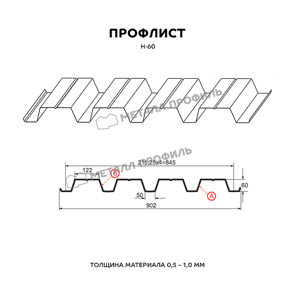 Профлист МЕТАЛЛ ПРОФИЛЬ Н-60x845-A (ОЦ-01-БЦ-0,5) часто используется для оформления кровли. Представляет собой лист оцинкованной стали с покрытием. Толщина металла с оцинковкой и полимерным покрытием составляет 0.5 мм. Проходя процедуру холодного проката, сталь приобретает рисунок из повторяющихся волн. Несущая способность профилированного листа гораздо выше плоского.