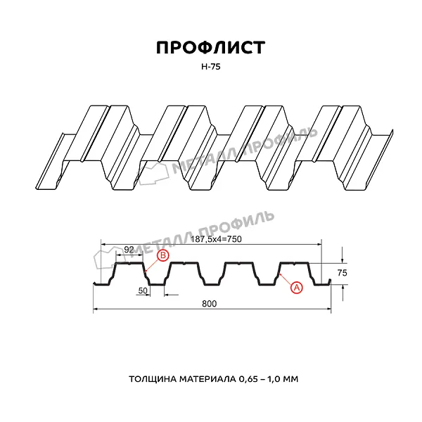 Профлист МЕТАЛЛ ПРОФИЛЬ Н-75x750-B (ПЭ-01-9010-0,7) — популярный материал для оформления профилированного листа. Представляет собой стальной оцинкованный лист с покрытием. Общая толщина металла с оцинковкой и защитно-декоративным слоем — 0.7 мм. Проходя процедуру холодного проката, металл принимает волнообразный вид. Такая форма придает профилю несущую способность.